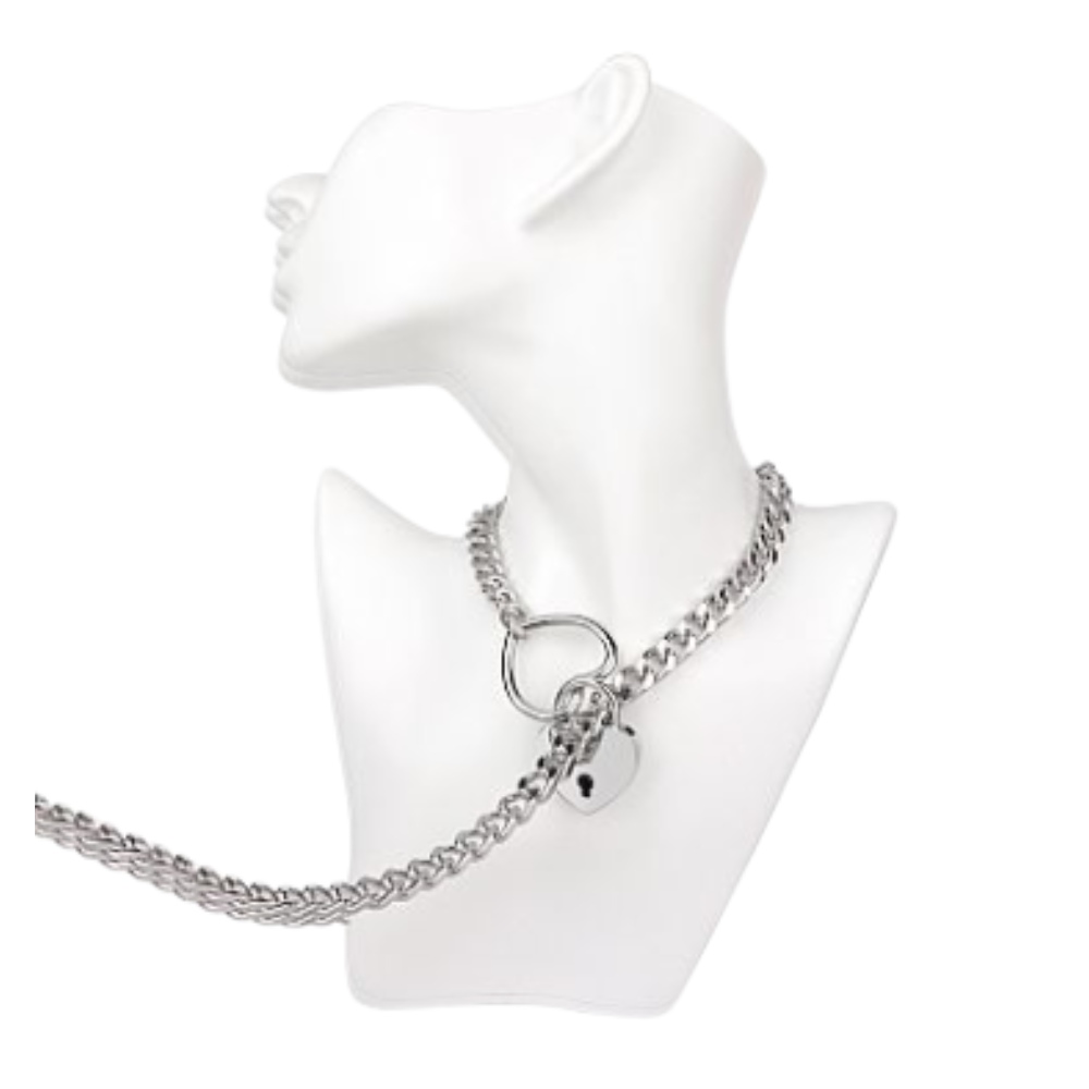 Produzida em corrente metálica resistente, essa coleira se destaca pela sua argola em formato de coração e pelo cadeado com chave, que adicionam um toque de exclusividade e simbolismo. Seu visual moderno e ousado é ideal para compor looks ou momentos mais íntimos com personalidade.