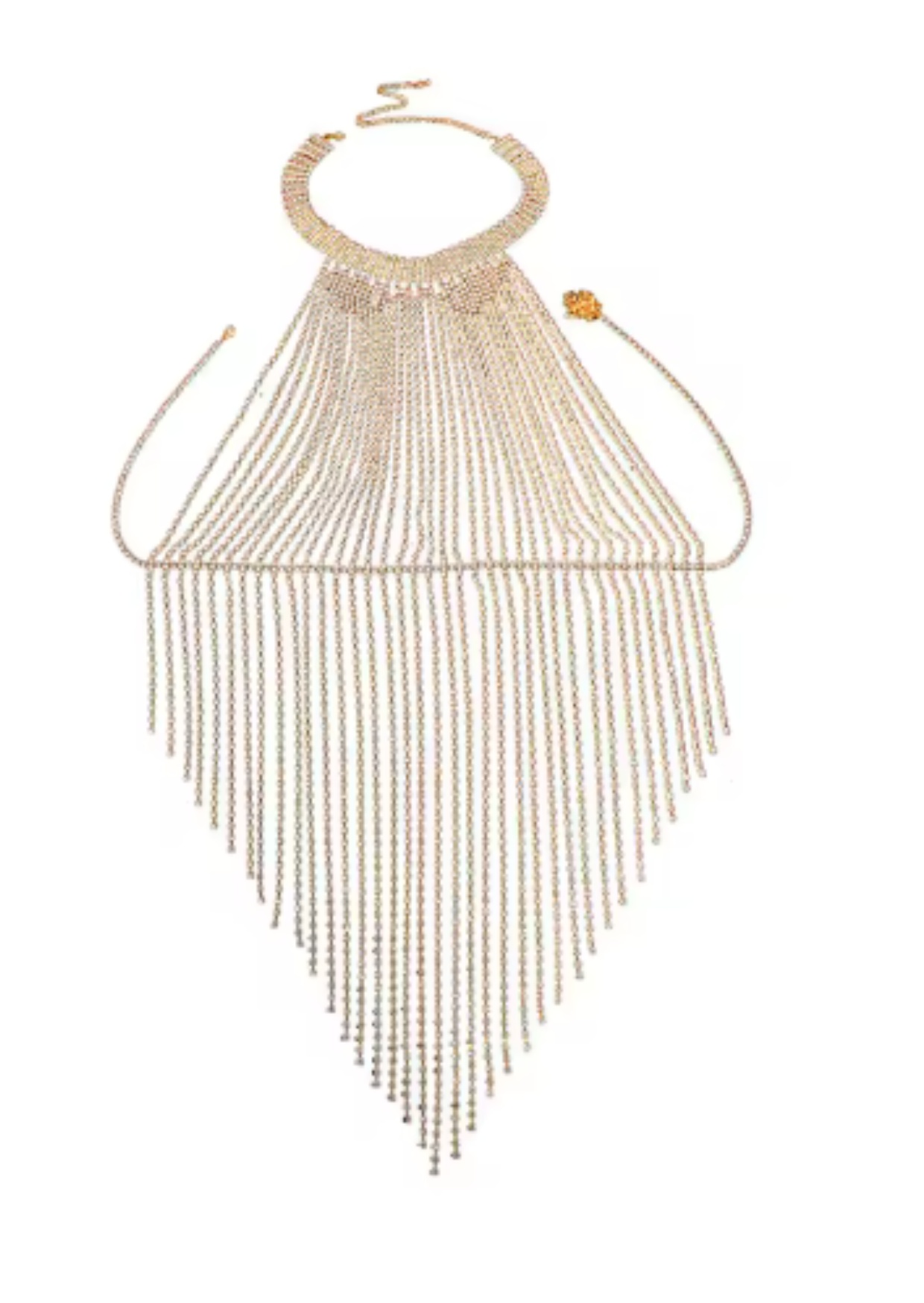 Seja no palco, nas lentes da câmera ou em um momento especial, a Frente Única em Fios de Strass com Franjas – Dourado proporciona presença, sensualidade e glamour em cada detalhe. Transforme sua produção em uma obra de arte viva — esta joia corporal é o toque final que faz toda a diferença.