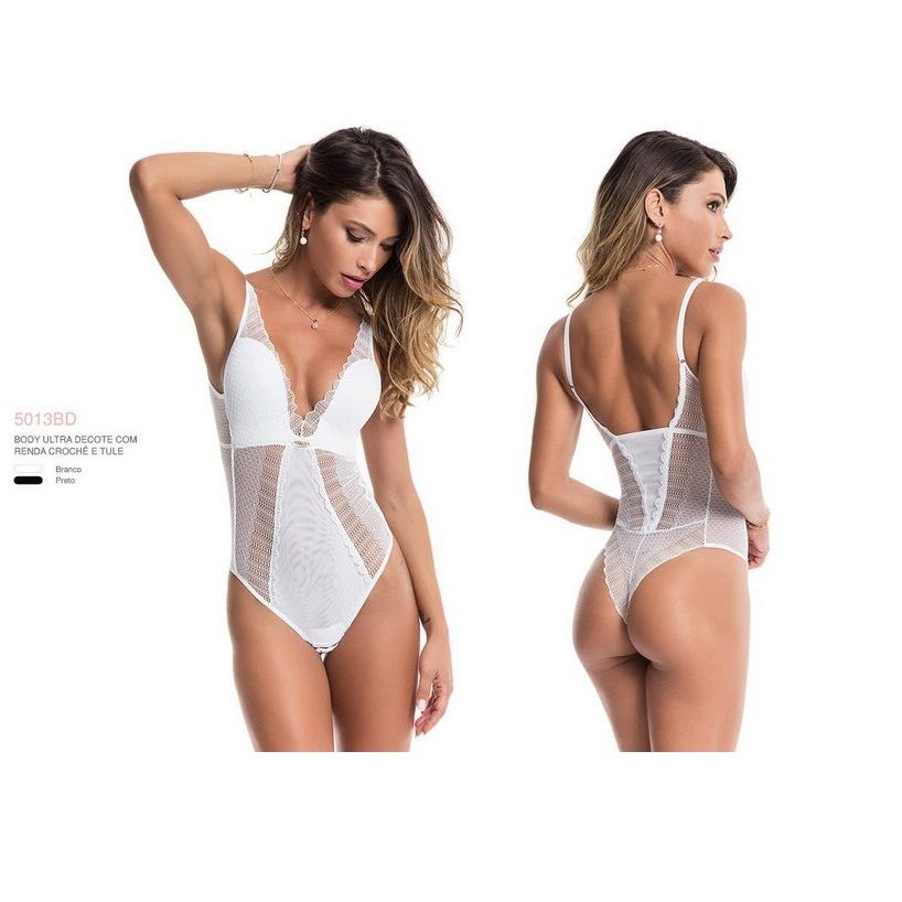 O Body Ultra Decote com Renda Crochê e Tule - Branco é a peça ideal para quem busca estilo e sofisticação. Seu design exclusivo com renda crochê e tule proporciona um visual elegante e sensual, valorizando suas curvas e permitindo diversas combinações com outras peças do seu guarda-roupa.